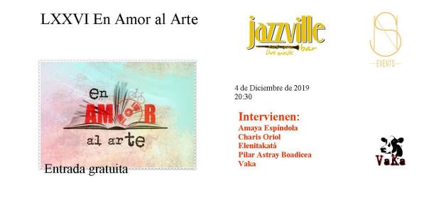 LXXVI En Amor al Arte Publicado el 12/01/201911/30/2019 por anuskavk en Noticias Entre En Amor al Arte y las meigas hemos decidido que diciembre es un mes feminista y lo hacemos con actuaciones solo de mujeres en esta edición LXXVI del mes de diciembre. En Jazzville, c/ Jesús Aprendiz 19 (entrada por Arias Moreno).